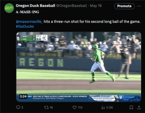 With the Oregon Baseball team I run the team Twitter account on game days. Below I have provided examples of some of my favorite tweets I have posted.